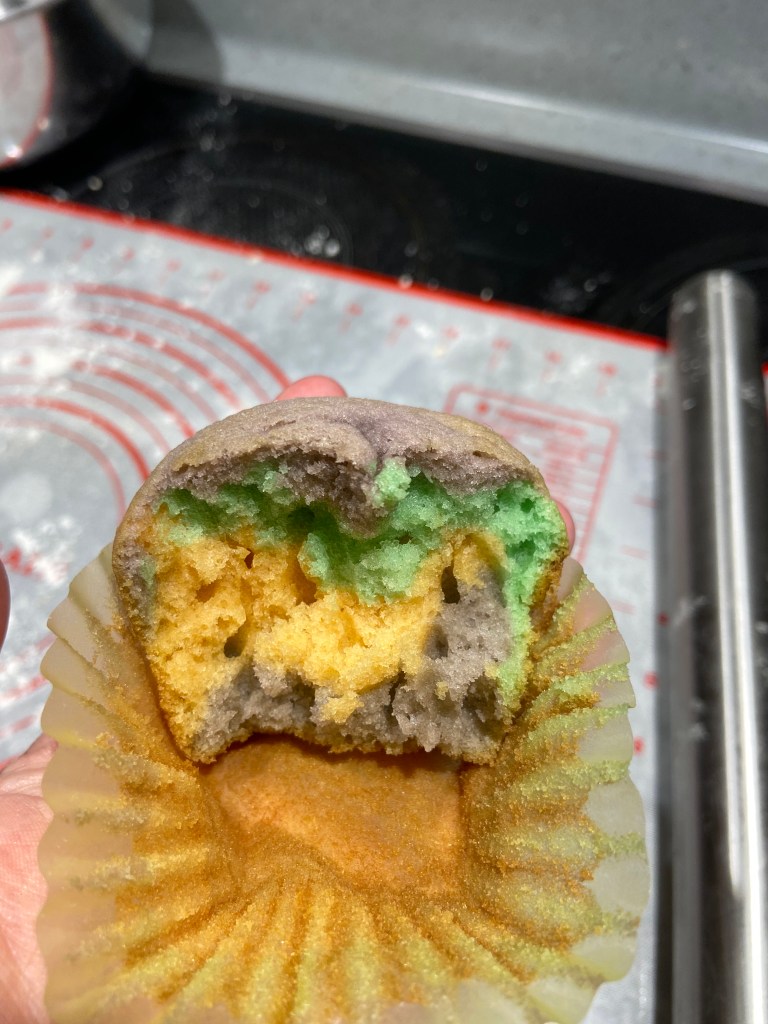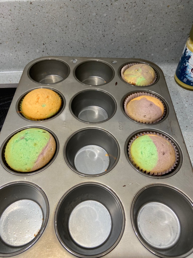 Anon, I came to the decision that the cupcakes needed to be multi-colored, I hopped back onto the 60’s & 70’s tie-dye trend that so many Zennials believe they began (yes, I was part of the early 2000’s tie-dye fad), oh to be so young and naive. Initially planning a grand total of five colors, approximating the colors in a rainbow. The cupcake-tin’s smaller size cured me of that nonsensical idea, and I came back to my senses around three colors: Orange (B’s favorite color), Purple (I believe the color exists somewhere on a non-existent unicorn, I mean this isn’t Scotland), and Green (come on, did you really think I wouldn’t add my favorite color). Groovy baby. I rummaged the internet for the best vanilla cupcake recipe and there was a clear winner, Preppy Kitchen’s Moist Vanilla Cupcake Recipe, which inspired, and was adapted for, the following attempts. (There is no affiliation with the aforementioned website or recipe) Wanting to avoid any tie-dye mishigas, the hereunder story occurred prior to the proposed party.