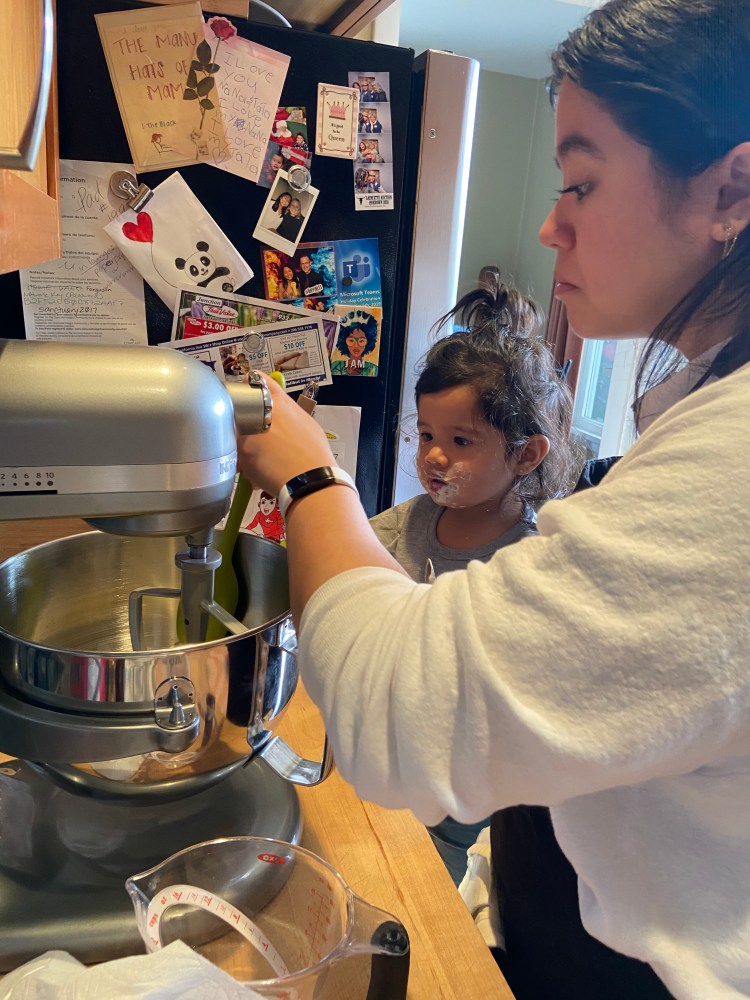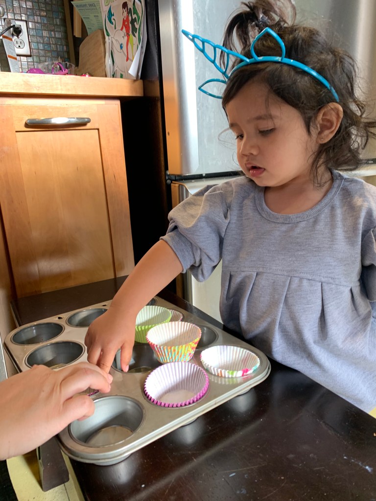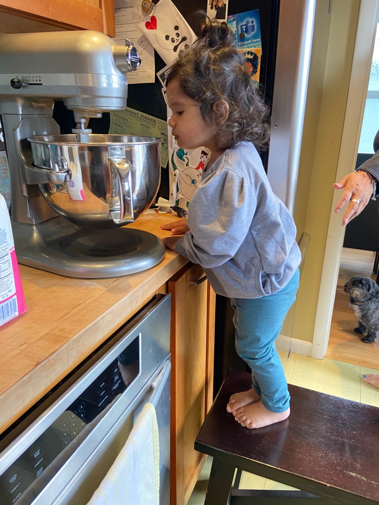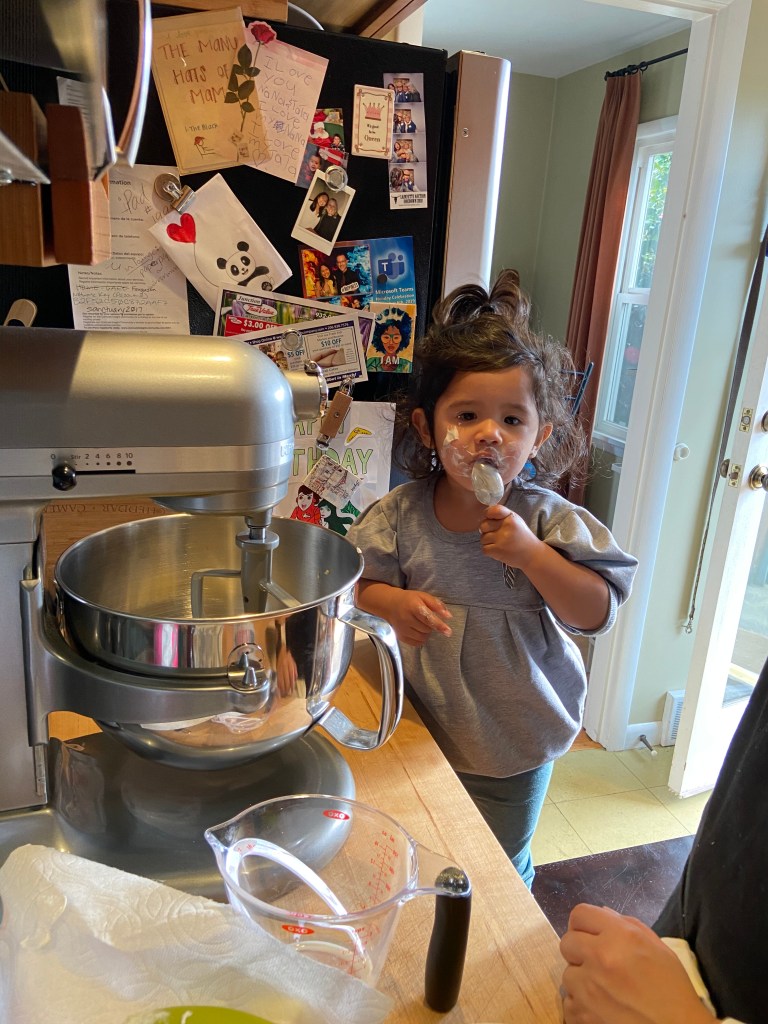 Fast-forward to the birthday party weekend, we find out that the fully-vaccinated, live-in grandpa has been exposed to Covid and is exhibiting symptoms in B’s household. Covid crashed the party and attempted to ruin the magical unicorn festivities. Measuring the health and safety of the situation, we forwent the party and settled on a post-covid-testing day to celebrate with the little one. A week or so after the unexecuted birthday party, we snatched her up for birthday activities, unicorn presents, and of course, cupcake baking & consumption. For a newly-minted two year old, she already has a knack for baking, and bonus she gets to test every ingredient before and after it’s mixed into the bowl. The butter and sugar were sufficiently tested and fault-free.