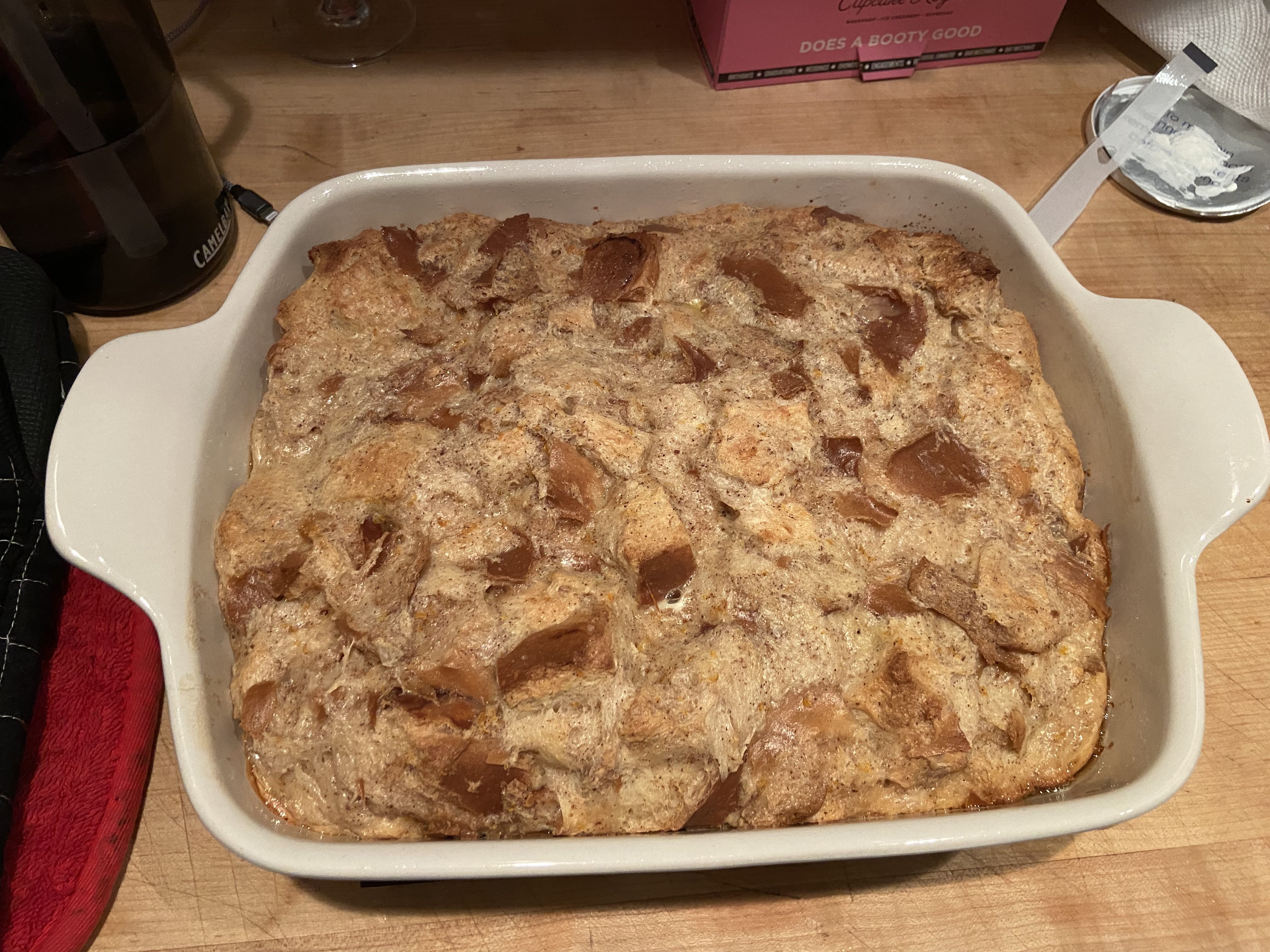 In a sauce pan, slowly heat and infuse the milk or half and half with sugar, salt, vanilla extract, and the aromatics of the zest of oranges, nutmeg, and cardamom until the kitchen smells like a boulangerie. Let the infused milk mixture cool slightly. This is crucial, unless you want scrambled eggs in your bread pudding, which I’m guessing you don’t. In a buttered casserole or lasagna dish, mix together the bread cubes, cooled milk concoction, and eggs. I choose to mix it directly in the baking dish because there is literally no point in dirtying up a bowl just to combine ingredients. I have better things to do than wash unnecessary dishes, like literally anything else. Make sure all the bread cubes are coated and then you’re set. Some people let this sit for 30 minutes to soak, but if you’re using day-old bread, it should absorb the liquid fairly quickly. If you’re using extra-stale bread, giving it a bit more time to soak isn’t the worst idea.